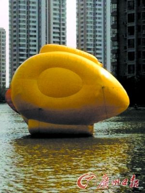 “大黄鸭”是荷兰设计师伦泰因·霍夫曼设计的巨型充气橡皮鸭,从2007年起,“大黄鸭”开始游历世界,每到一处,都引来无数“鸭粉”狂热追捧。今年5月,一只16米高(相当于6层楼)的“大黄鸭”在香港维多利亚港展出,引起轰动,每天有二三十万人争睹。