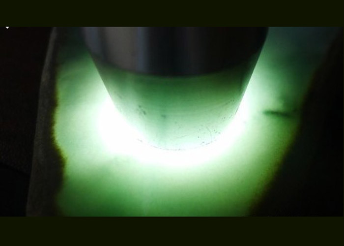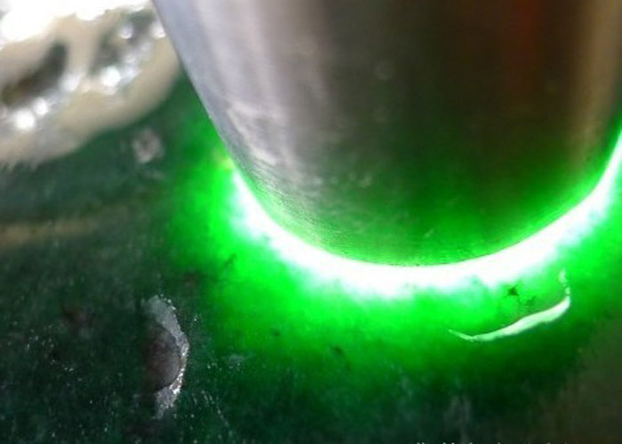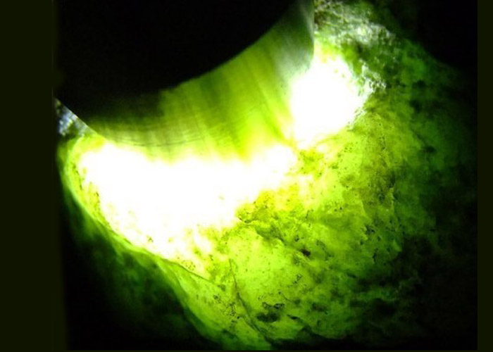 31/40图为色料——糯种阳绿原石打灯表现图片。人民网艺术收藏频道郑重提醒您:赌石有风险,入场需谨慎。