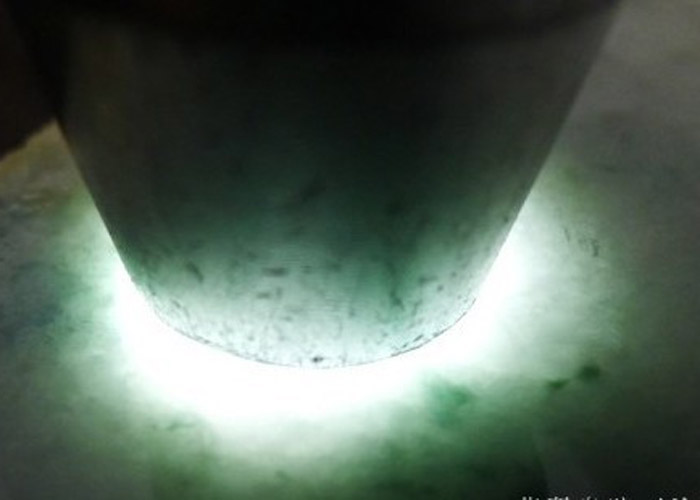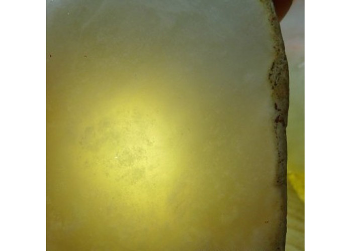 12/40图为糯冰原石的打灯表现,看上去跟熬化的糯米汤一样,看不到结构,但是底子浑浊。人民网艺术收藏频道郑重提醒您:赌石有风险,入场需谨慎。