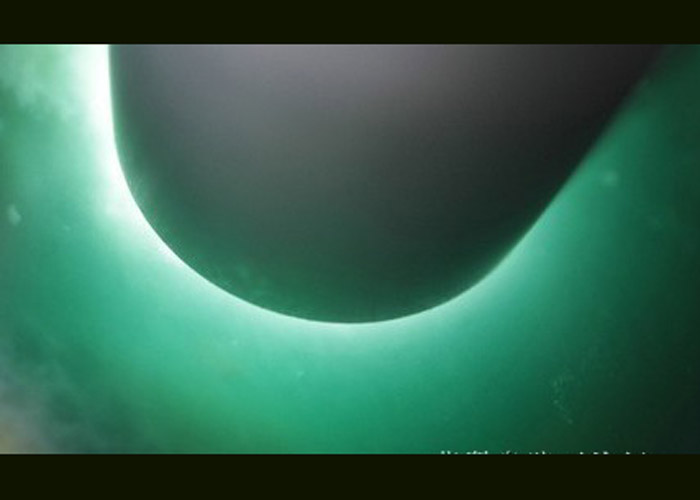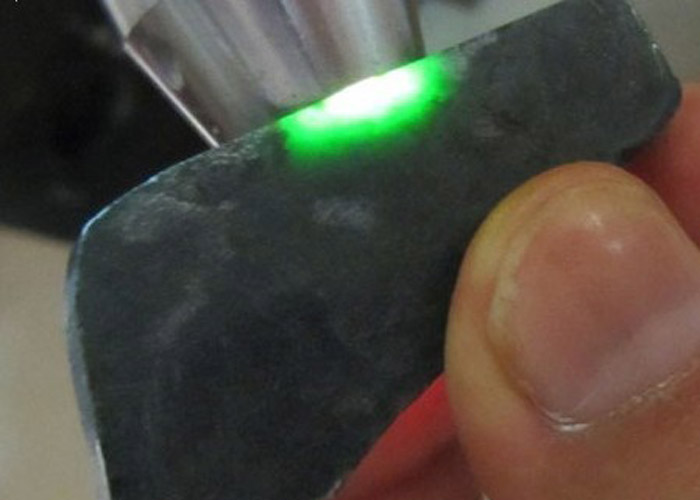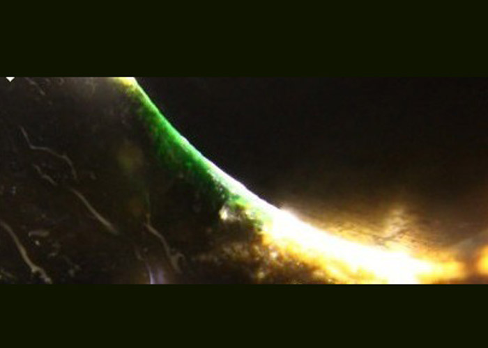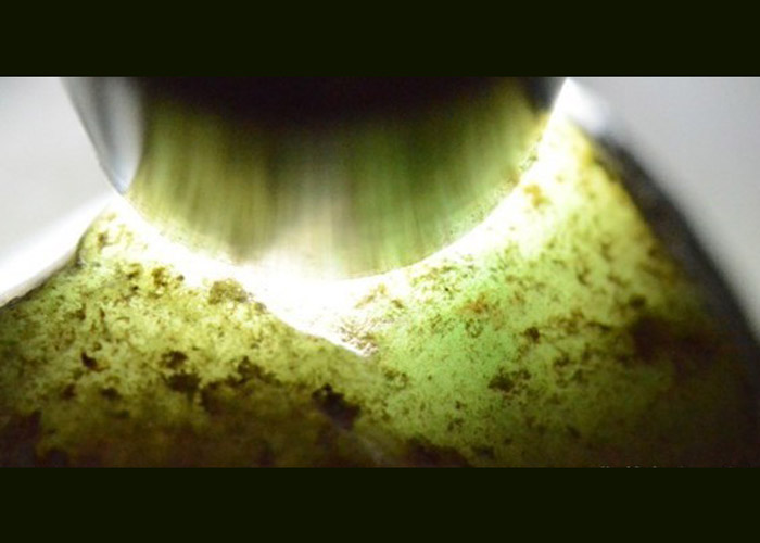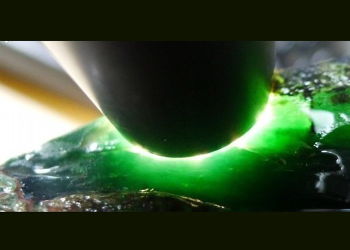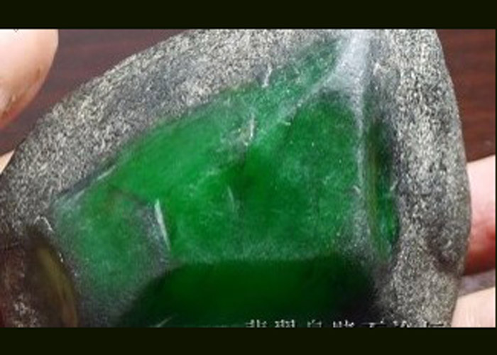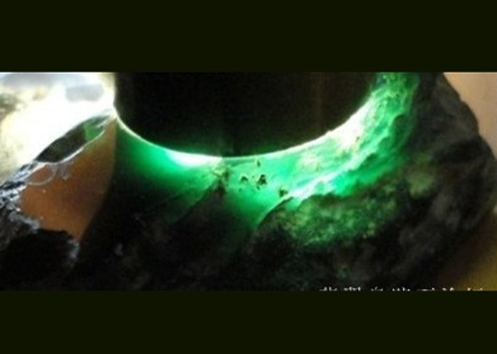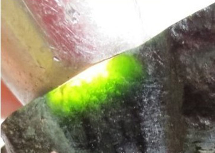25/40图为墨翠原石打灯图。因为其颜色深、结构致密,打灯就是一丝阳绿,如果光圈过大,就要小心了。人民网艺术收藏频道郑重提醒您:赌石有风险,入场需谨慎。