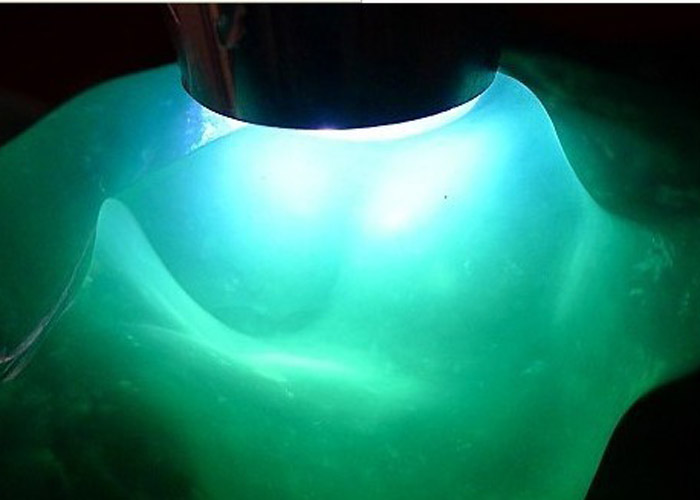 22/40图为蓝水墨翠原石打灯图。由于墨翠一天一天的升值,大家讨论的也比较多,下面分别发几张容易弄混蓝水墨翠的原石图片给大家看。目前好的蓝水墨翠也是非常贵的。人民网艺术收藏频道郑重提醒您:赌石有风险,入场需谨慎。