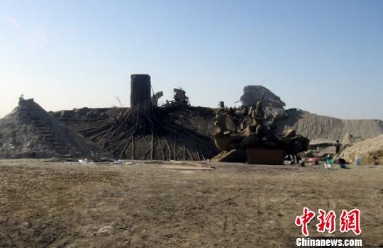记者在现场看到,来自沈阳的著名雕塑家娄春亭指挥大伙们分头忙碌。娄春亭介绍,组雕的前端正中为西王母乘着凤船劈浪前行的雕像;左为沙土堆积的山包,顶部微雕为西王母驾8匹骏马大车风驰电掣;右为沙土堆积的山包,顶部微雕为西王母骑着凤鸟飘然而至;中端为水池,沙土下挖两米多深自然出水,象征从昆仑山下来的喀什噶尔河、叶尔羌河、克里雅河、和田河汇成塔里木河——源远流长,生生不息;后端为挖水池的土堆积成5米多高的山梁,和前端的左右山丘一样以衬托正中的西王母;山梁顶部左侧“扶桑”高耸,根部以下顺山势像手指一样地伸展密集的根系,象征人类“根文化”;右端沿山势塑成人眼虎齿豹尾的西王母巨幅像。