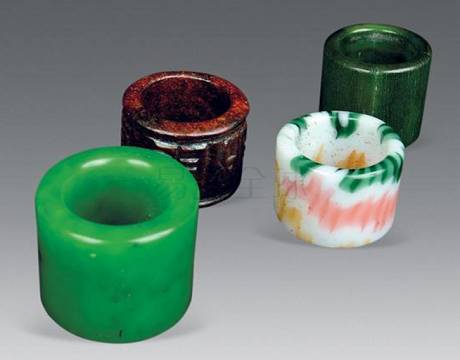 扳指,它的前身叫做韘(音射)《说文》曰“韘,射也”,说明此器为骑射之具。它是一种护手的工具,带于勾弦的手指,用以扣住弓弦。同时,在放箭时,也可以防止急速回抽的弓弦擦伤手指。古人亦称为“机”,意义类似于“扳机”,表示扳指的作用相当于扳机。韘初见于商代(公元前17世纪至公元前11世纪),在春秋、战国(公元前8世纪至公元前3世纪)的时候就十分流行使用扳指了。
