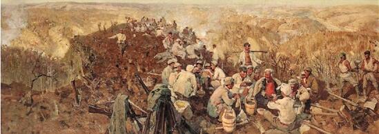 上世纪五六十年代,靳之林在留校任教时多次去到延安进行采风,创作了一大批反映陕北题材的作品和革命历史画。他的代表作油画《南泥湾》便是创作于那个时期,作品把波澜壮阔的黄土高原壮丽景色与当年垦荒战士的生产、战斗、学习、生活统一起来,以生动的人物造型组合,真实地反映了特定的时空情景,充分表现了艰苦奋斗、自力更生的革命乐观主义。整个画面真实生动,十分质朴,散发着黄土的气息,看着这幅画,仿佛又回到了那段难忘的岁月。