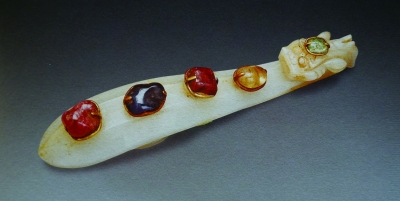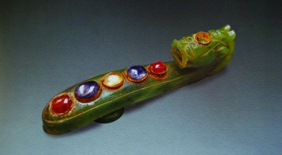 晚明玉带钩型制具有自身的时代特点,大量使用动物、植物造型,如琵琶形、螳螂肚形、条形、圆棒形等,这些造型基本来源于上古时代。高濂指出,“若指南人蚩托轴辂饰诸具,弁星蚩牛环、螳螂钩、辘轳环、螭彘、蟠螭环、商头钩、双螭钩、玉套管、璩环、带钩、拱璧,皆王侯舆服之饰也。”(《燕闲清赏笺》上卷)又屠隆、文震亨等提出,“古铜腰束绦钩,有金、银、碧瑱嵌者,有用兽为肚者,皆三代物也。有羊头钩、螳螂捕蝉钩鏒金者,皆秦汉物也。”(《长物志》卷七·钩)由此看出,晚明玉带钩蟠螭、螳螂、羊头等兽形纹样,皆是仿上古而作,另有花草纹样装饰的带钩则是元朝之遗风。晚明玉带钩造型尤以龙首蟠螭组合常见,龙首带钩具有双脚后抿、双眼突出的特点,蟠螭的头多呈三角形,额头较宽,尾巴分卷,钮矮而贴体背。明定陵出土的3件玉带钩可视为晚明时期的代表作,其中两件为龙形玉带钩,一件为羊首形玉带钩,器物材质分别为金镶宝石玛纳斯碧玉、金镶宝石白玉和水晶三种。两件龙首玉带钩有别于他者之处,是在龙首、钩身上镶嵌各色宝石若干,钩身以红宝石、蓝宝石、透明宝石进行装饰,龙首则镶嵌祖母绿。宝石下面均为圆棱形金托,托底有两孔,用于穿金丝与带钩上的对穿孔连接。另外一件羊首水晶带钩,钩身布满云絮状杂纹,似是羊毛般附着羊身。用料之考究,制作之精良,是晚明其他玉带钩所不及的。